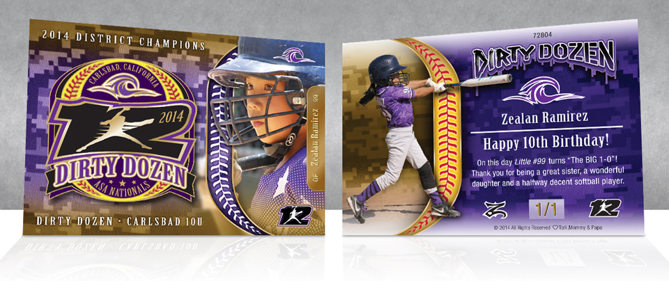 The Dirty Dozen was our 10U All-Star softball team right here in Carlsbad, California. The girls (including my daughter) were fortunate to win Districts and go experience the 2014 ASA Nationals in Roseville, California. The team went 3-2 and took 9th out of 42 teams. It was an amazing summer with some amazing girls. Here’s some work I did for the team along with a special birthday card I made for my favorite player.